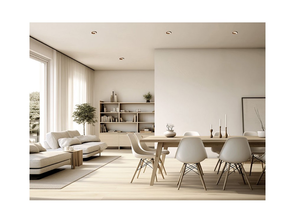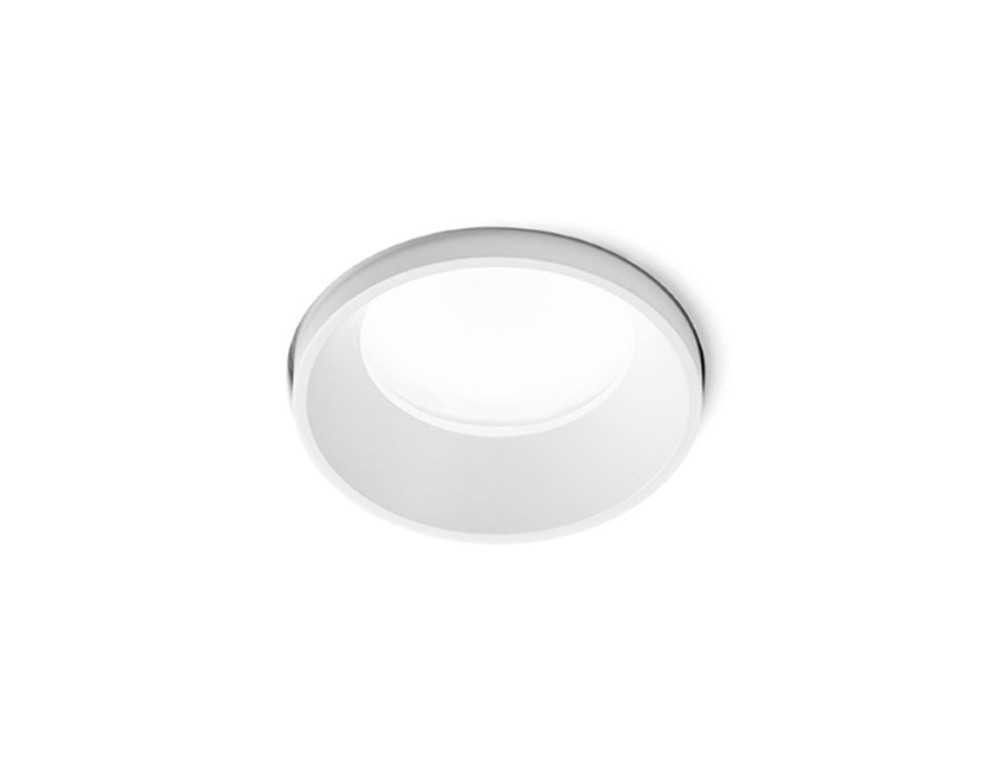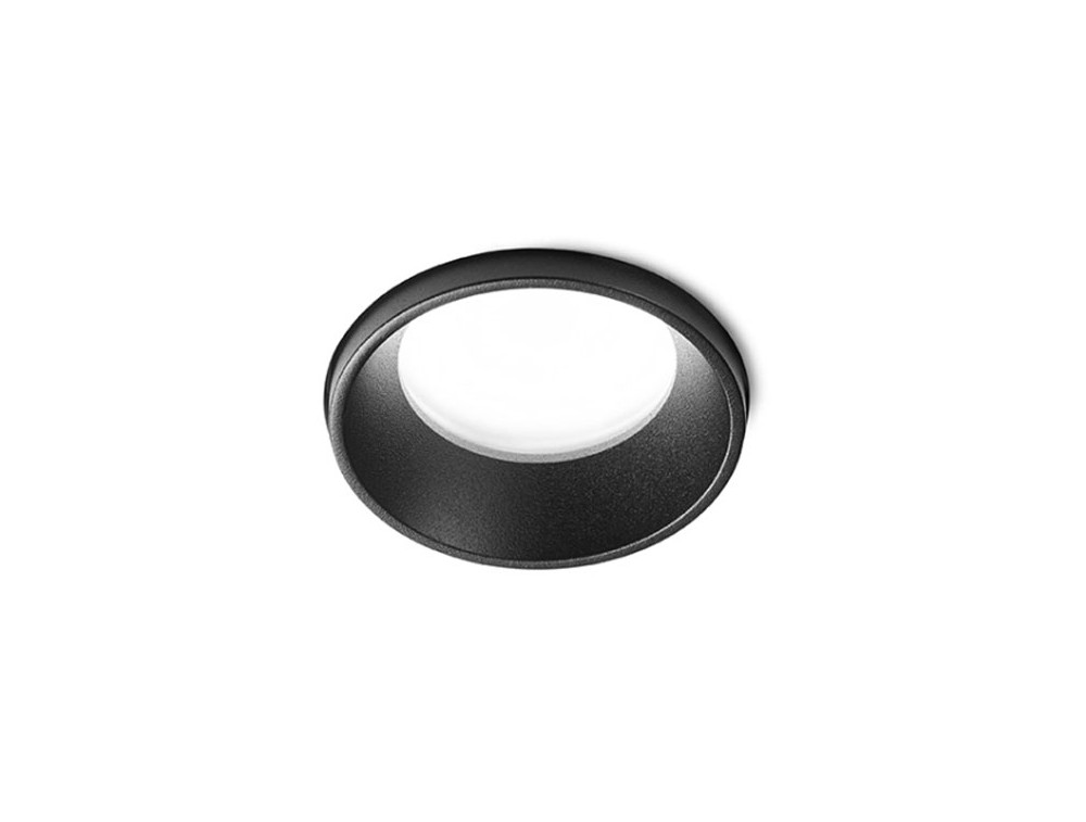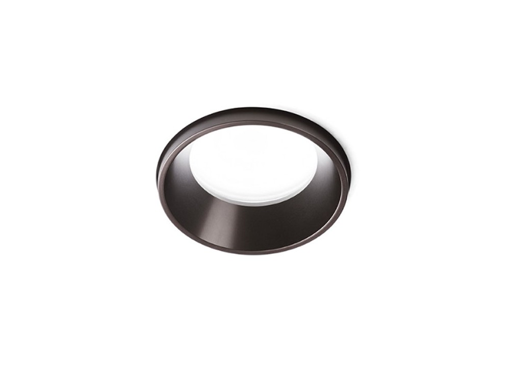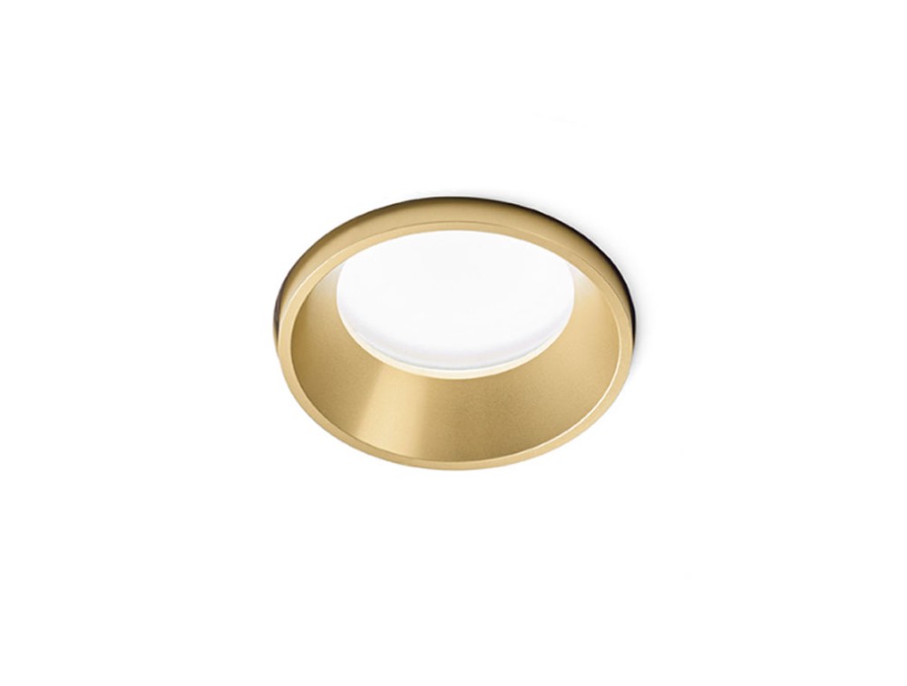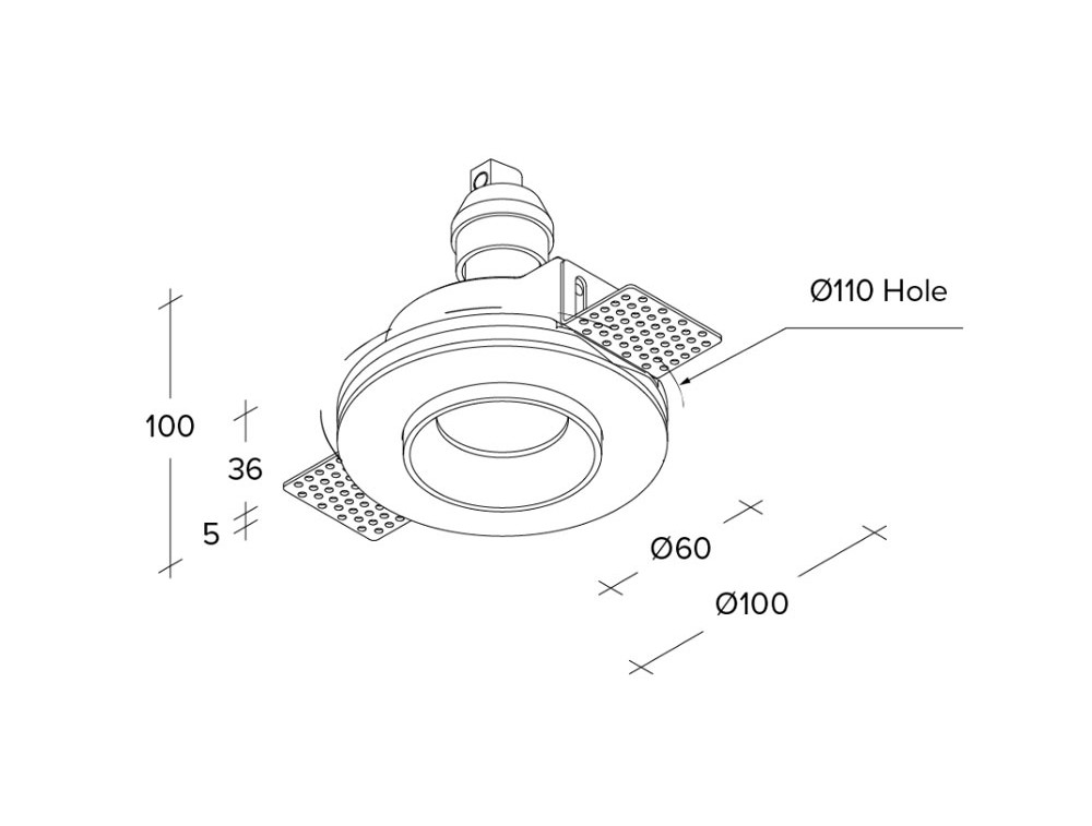 Faretto da incasso in gesso con anello in acciaio spazzolato a filo muro. Portalampada GU10. Il faretto, installabile nel cartongesso, una volta rasato risulta parte unica con la struttura. Grado di protezizone IP54.
