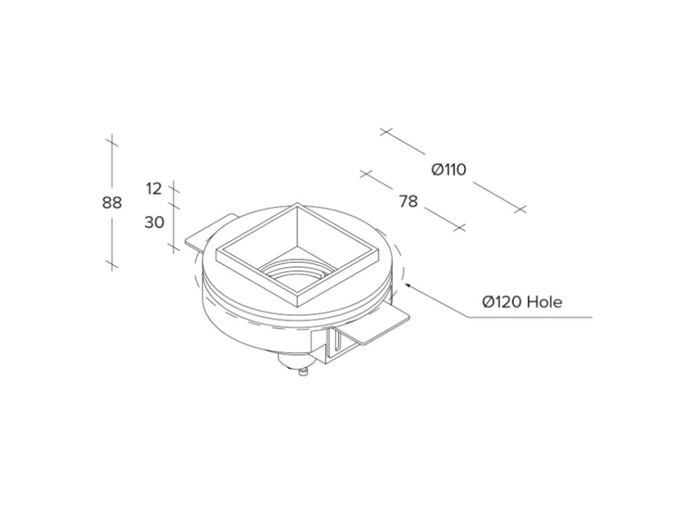 Faretto da incasso in gesso, con elemento metallico in finitura ottone, nero, rame o bianco. Portalampada GU10. Il faretto, installabile nel cartongesso, una volta rasato risulta parte integrante con la struttura.