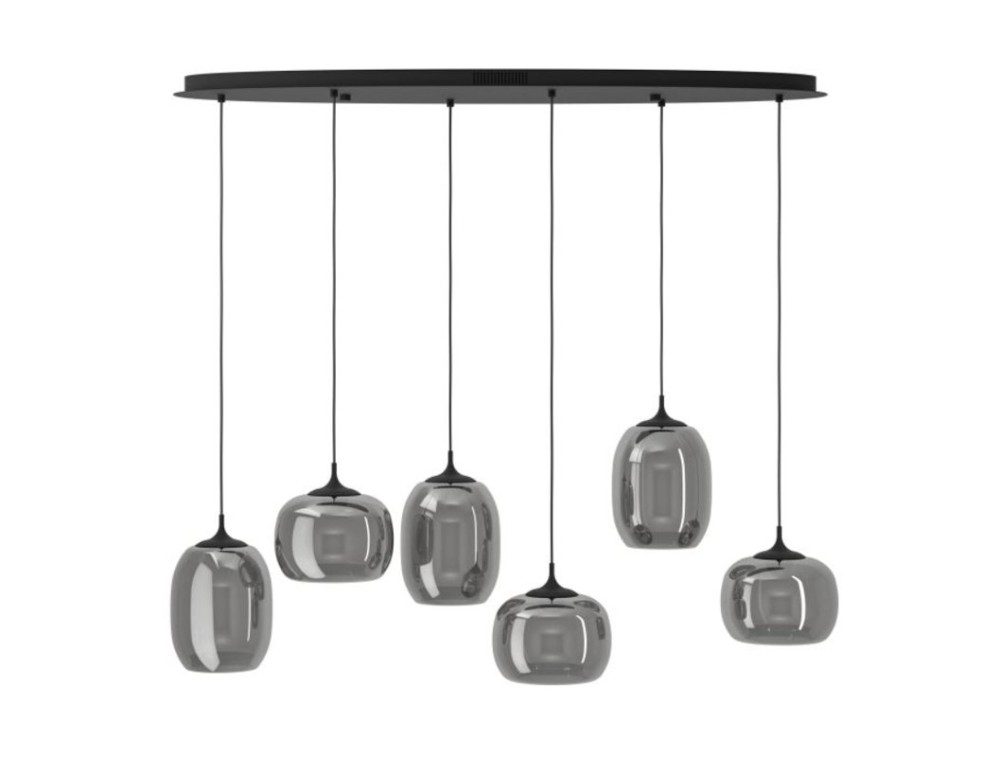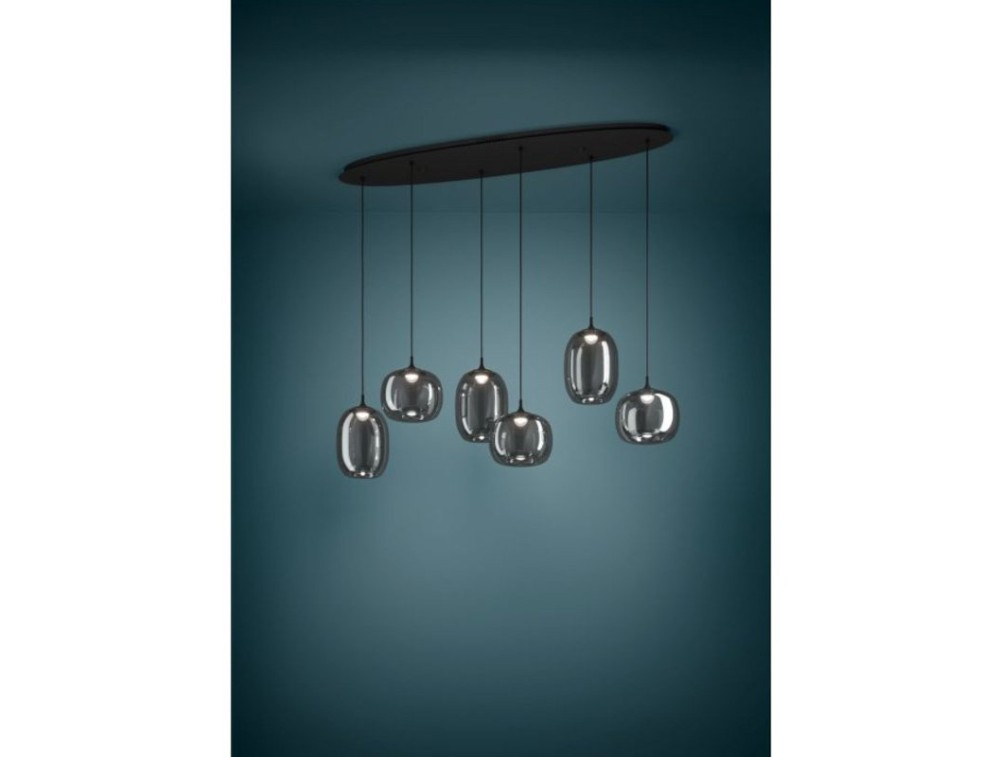 Sospensione della linea Larva in acciaio con 6 diffusori in vetro soffiato color nero trasparente, il quale dona un tocco di lusso e unicità all'ambiente. Grazie al suo design attira gli sguardi anche quando è spenta