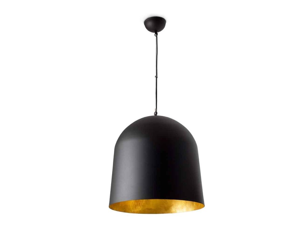 Lampada a sospensione realizzata con struttura in alluminio nero e interno oro.