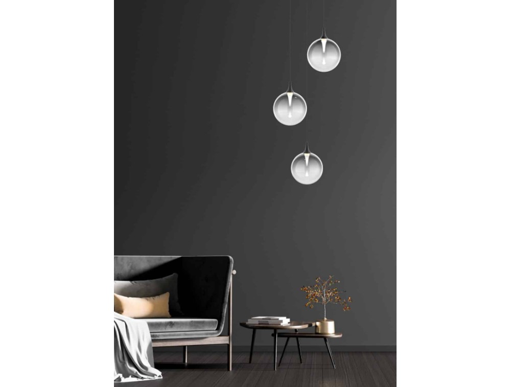 Sospensione con 3 lampade con sfere in vetro soffiato e base in metallo. Disponibile nero opaco con vetro fumee o trasparente, oro satinato con vetro trasparente o ambra o oro satinato e vetri mix. Protezione IP20. Ideale per cucina, salotto e camera da letto. Perfetta per combinazioni in serie.