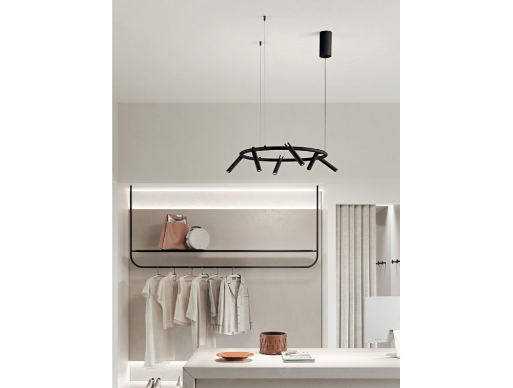 Sospensione LED in metallo verniciato con luci orientabili. Disponibile tortora o nera. Intensità dimmerabile. È la soluzione ideale per ampi open space, aree retail o sopra grandi tavoli da pranzo, dove è necessaria una presenza visiva importante ma leggera.