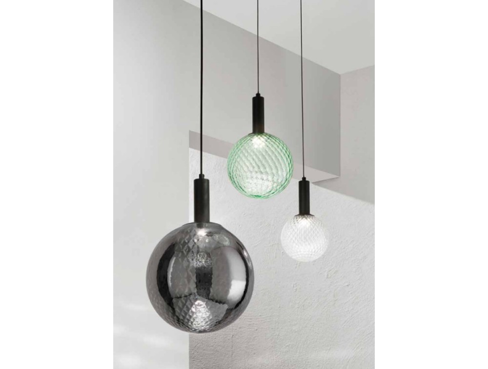 Sospensione LED diametro 30 cm, in metallo verniciato e vetro soffiato con decorazione balloton. Sfera disponibile in diversi colori tra cui ambra, verde, fumee e trasparente e finitura disponibile oro o nero. Cavi regolabili. Ideale sopra il tavolo da pranzo poiché la luce diffusa lateralmente e verso il basso crea un'atmosfera conviviale e accogliente, zone living o bar perfetta per banconi da cucina o aree relax dove si desidera un'illuminazione d'accento che non abbagli. Inoltre si abbina perfettamente a materiali come il legno, il cemento a vista o dettagli in metallo.