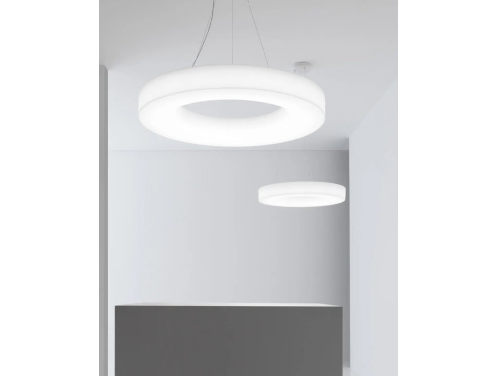 Realizzata con montatura in metallo e diffusore in polietilene, Saturn è un anello luminoso imponente ed elegante, progettato per creare un’illuminazione uniforme e avvolgente. La sua geometria essenziale esalta il minimalismo contemporaneo. Il diffusore opalino, disponibile in due diametri, emana una luce ambientale uniforme e altamente performante rendendola ideale per i grandi spazi dell’architettura contemporanea. Finitura bianca.