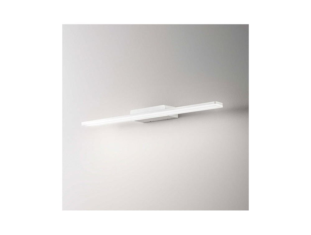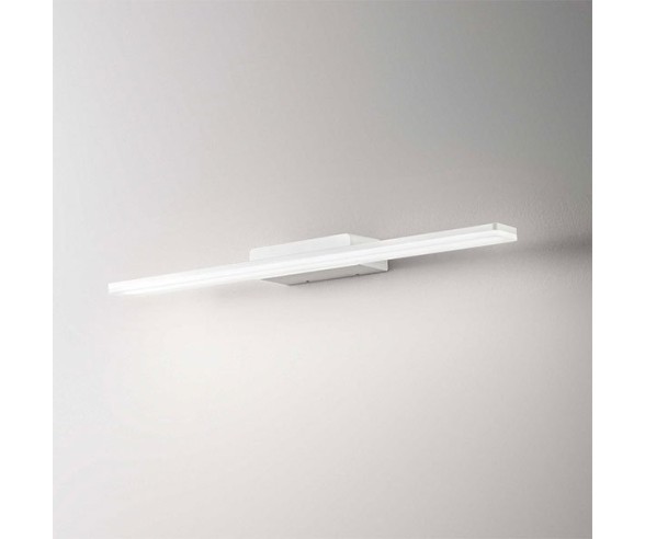 Applique moderna perfetta per essere collocata sopra lo specchio in bagno. Base e corpo luce in alluminio verniciato a polveri. Diffusore in acrilico trasparente satinato.