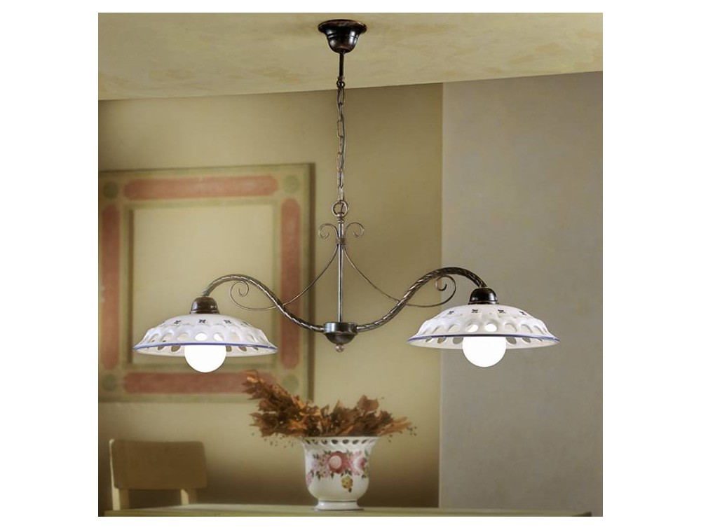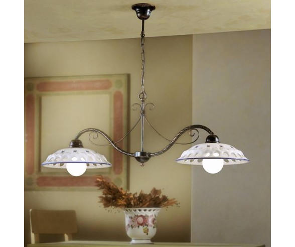 Bilancere di design rustico realizzata con diffusore in ceramica decorato a mano con struttura in metallo, nastro non incluso. Lampada dalle linee sinuose, grazie ai fori collocati lungo tutto il diametro del bordo inferiore del diffusore è possibile adornare la lampada con dei nastri colorati a seconda delle tonalità presenti nell'ambiente residenziale del cliente. I dettagli su ceramica sono interamente realizzati a mano, motivo per il quale è possibile personalizzarli su richiesta.