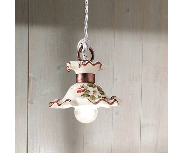 Sospensione dal design rustico realizzata in ceramica lucida, decorata a mano con motivi floreali e struttura in ottone. Lampada dal diffusore dai contorni ondulati e frastagliati, perfetta per valorizzare un ambiente rustico, struttura in ottone. Le lampade ferroluce offrono una vasta scelta nei decori, i quali sono completamente realizzati a mano, dettaglio grazie al quale è possibile richiederne la personalizzazione.