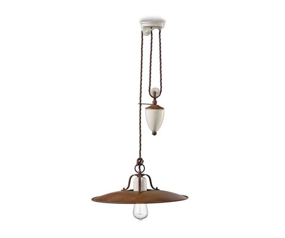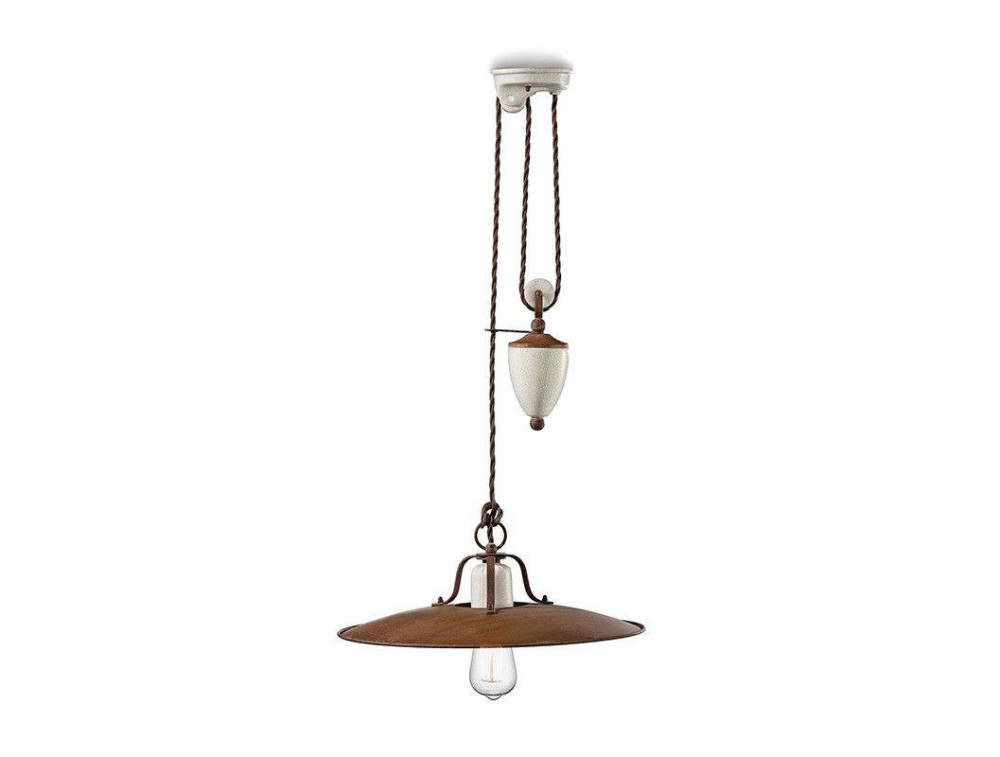 Ferroluce illuminazione, sospensione realizzata con struttura in metallo ossidato e diffusore in ceramica craquelè.