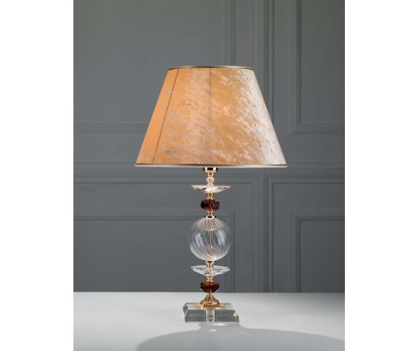 Lume classico con struttura in cristallo ottico trasparente e ambra. Particolari in ottone oro francese e cristalli Schöler. Lampada realizzata con materiali pregiati in finiture preziose, dettagliato nella linea. Grazie ai suoi numerosi dettagli in cristallo ed alla finitura in oro francese regala all'ambiente un tocco di eleganza.