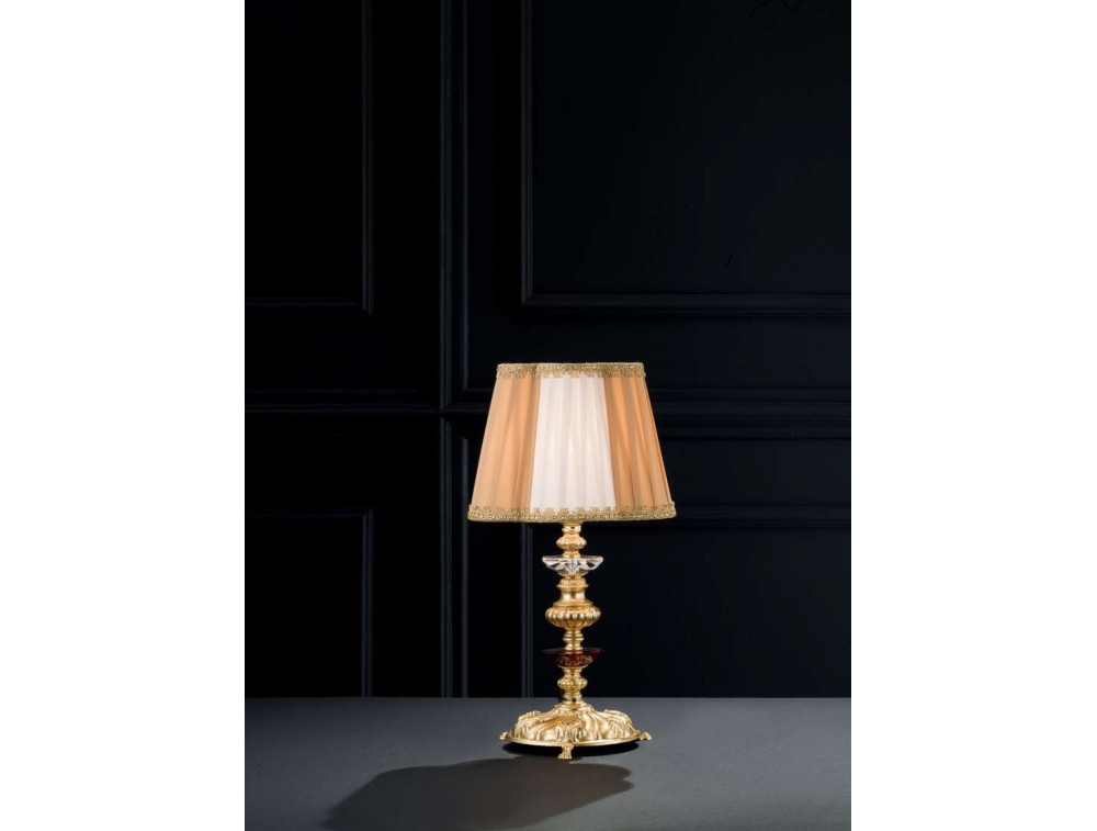 Lume realizzato con struttura in ottone finitura foglia oro con pendagli e particolari in cristallo sholer. Lampada dal design classico grazie alla struttura in finitura foglia oro e dettagli in cristallo sholer color ambra. Lume ideato per donare una luce d'effetto nell'ambiente in cui viene collocata conferendo importanza ed eleganza alla stessa.