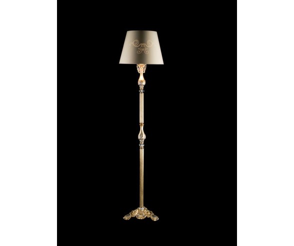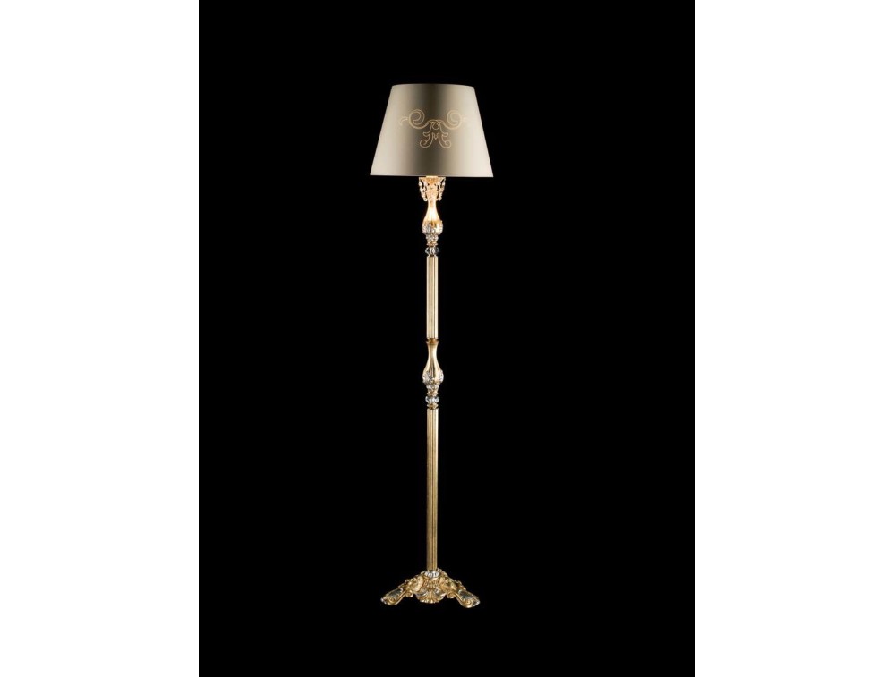 Piantana realizzata con struttura in ottone finitura oro francese e foglia argento, paralume in tessuto con pendagli Schöler crystal. Lampada dal design classico curata minuziosamente in ogni minimo dettaglio, dal dettaglio del paralume serigrafato da ghirigori ai dettagli in cristallo e dalla finitura in oro francese.