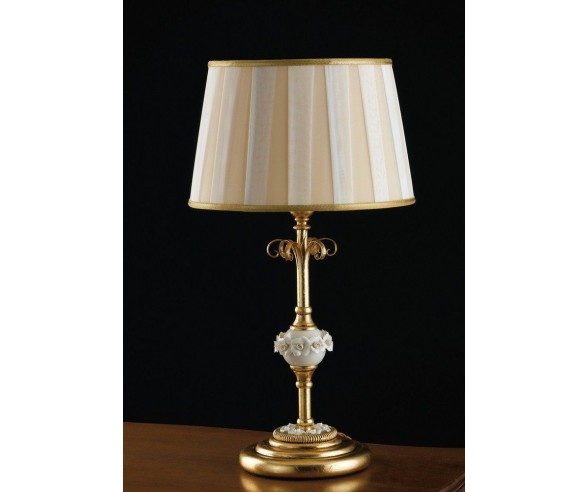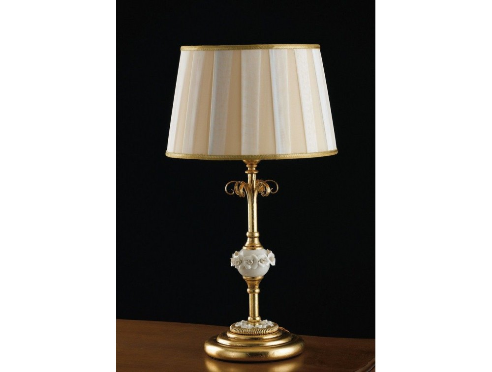 Lampada da tavolo di design classico realizzata con struttura in ferro battuto in finitura foglia oro e porcellana lucida bianca, paralume in stoffa con cordoncino color oro. Lampada dal design elegante e raffinato grazie ai dettagli che ne arricchiscono la struttura come le roselline in ceramica ed il paralume fasciato a doppia finitura. Lampada ideale in ambienti dello stesso stile d'arredamento come soggiorni, salotti, zone living e camere da letto.