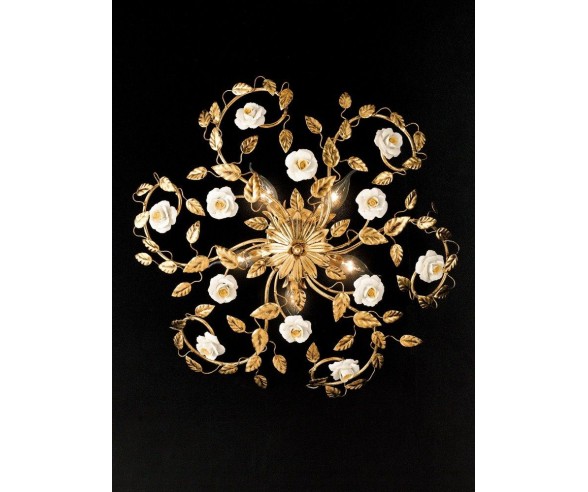 Plafoniera classica realizzata con struttura in ferro battuto in finitura foglia oro e particolari in porcellana. La linea di questa collezione segue un'antica tradizione artigianale nella lavorazione e decorazione della struttura e del paralume, lo stile e i materiali di cui sono realizzate sono lavorate completamente a mano, creando un giusto equilibrio tra armonia e forma. Ideale in ambienti di design classico di ogni tipo.