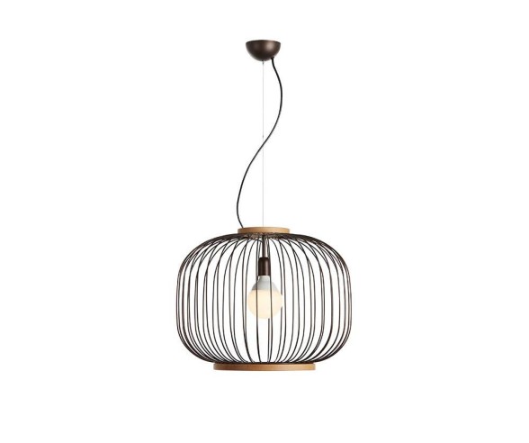 Gibas illuminazione, lampada a sospensione contemporanea in tondino d’acciaio sagomato e verniciato a polveri epossidiche. Le due fasce che chiudono il corpo tondeggiante sono in legno naturale.