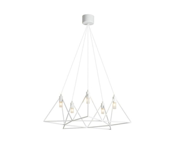 Gibas illuminazione, lampada a sospensione contemporanea con luci in tubo di acciaio verniciato a polveri epossidiche. I diffusori ai vertici dei moduli geometrici sono in borosilicato satinato.