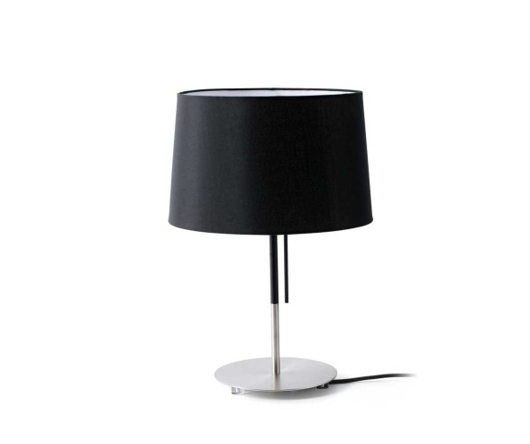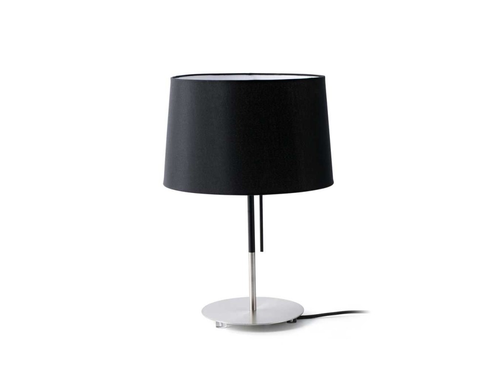 Lampada da tavolo realizzata con struttura in metallo nichelato e paralume in tessuto bianco o nero. Si accende tramite interruttore.