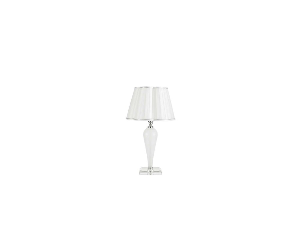 Ciciriello, lampada da tavolo realizzata in vetro lavorato a mano bianco satinato. Dettagli in cristallo ottico. Finiture in metallo cromato. Disponibile in due diverse misure.
