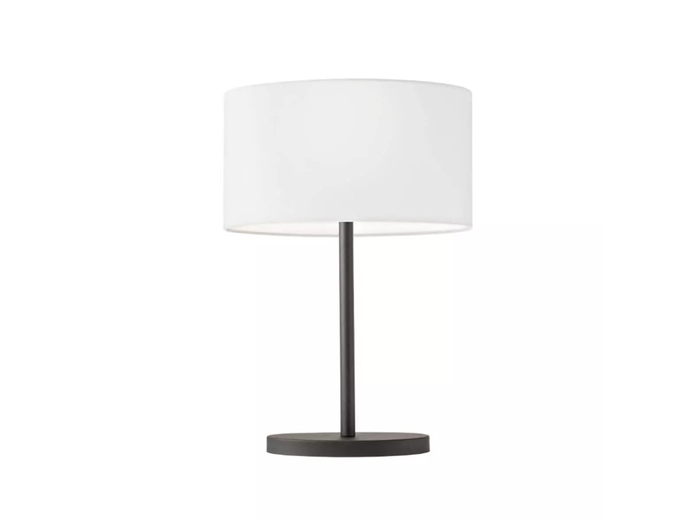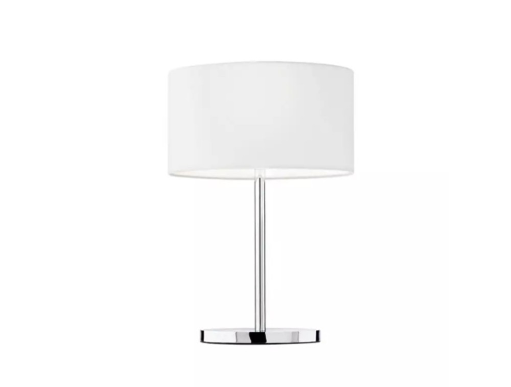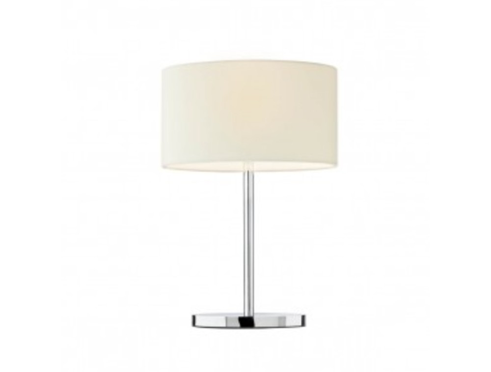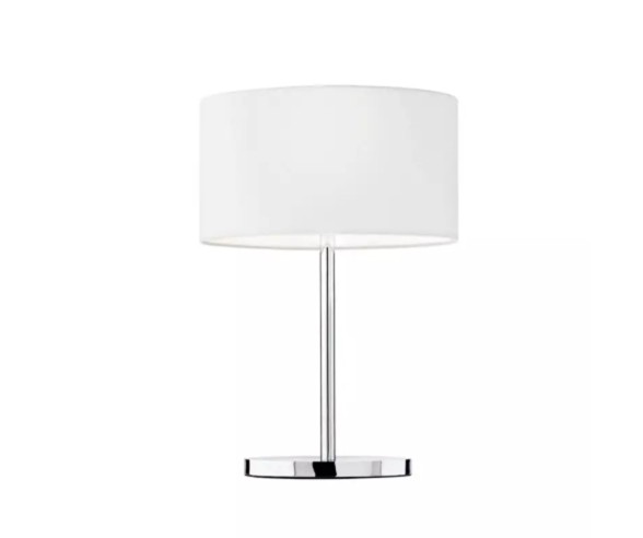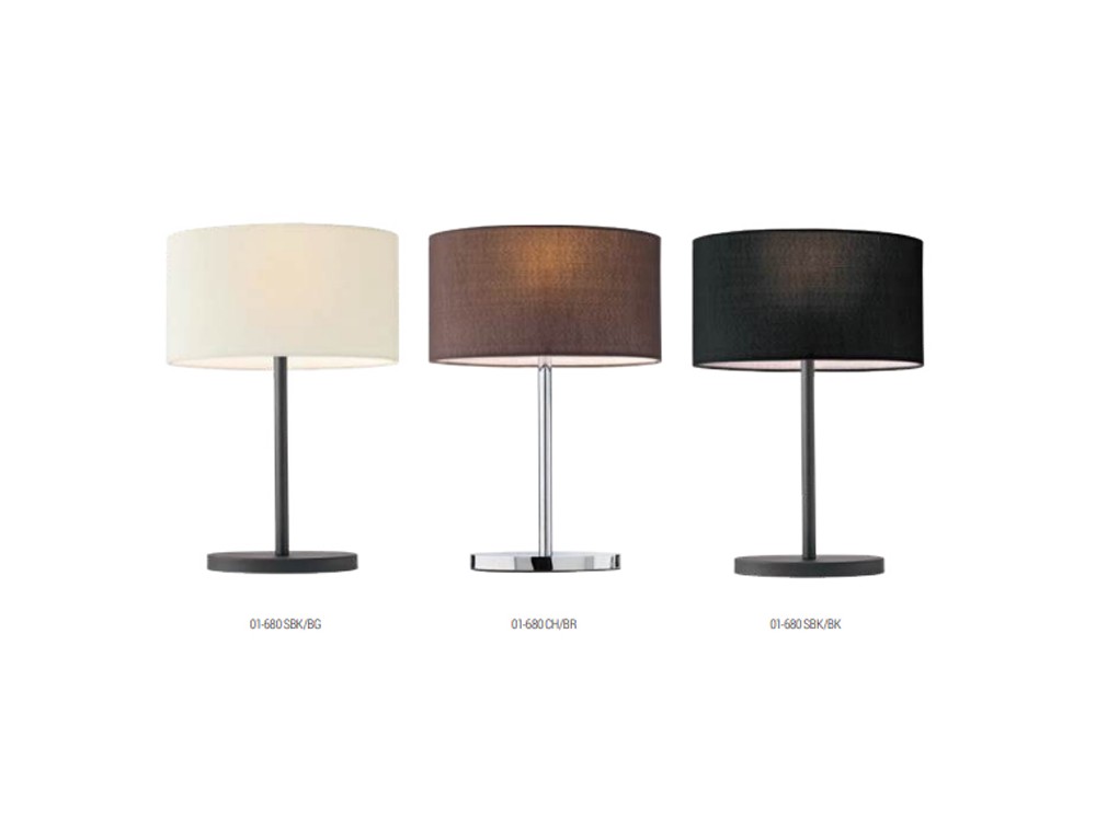 Lampada da tavolo per interni, struttura in metallo cromato o verniciata a polveri nero opaco, paralumi in PVC bianco rivestito in tessuto nelle varianti colore bianco, marrone, beige e nero.