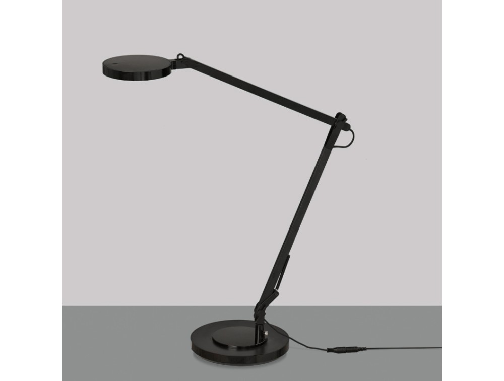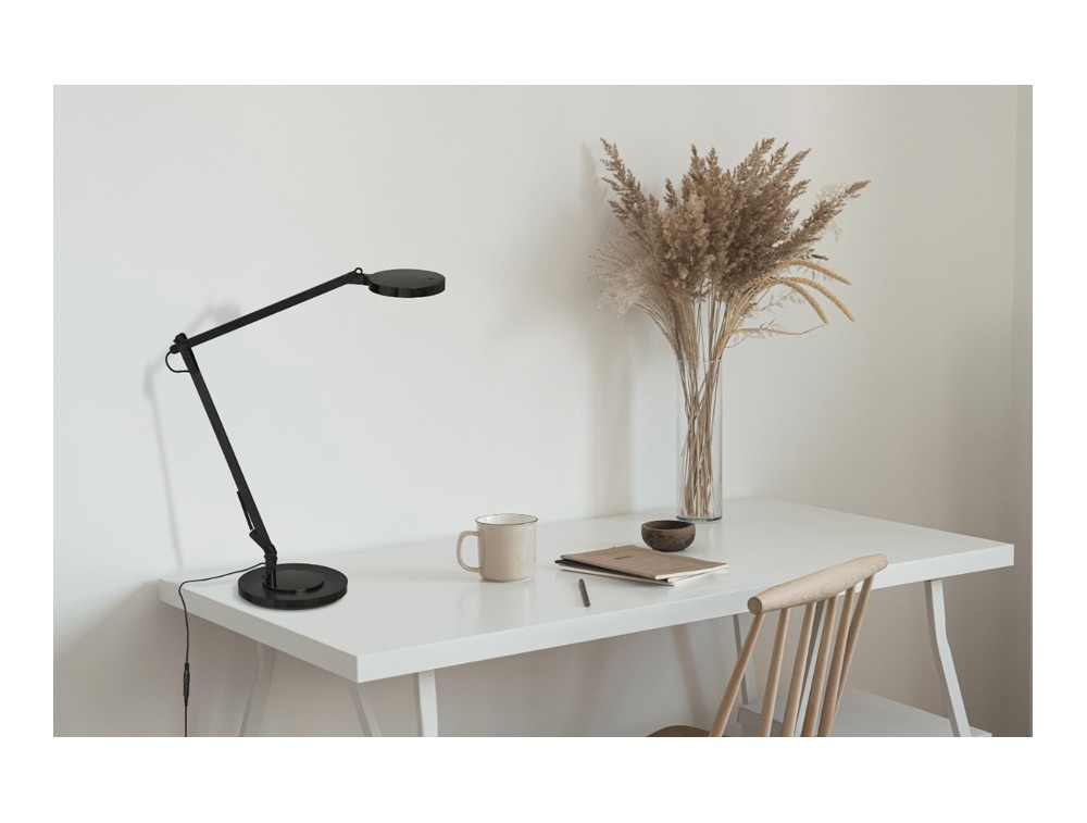 Realizzata in alluminio e policarbonato nella finitura nera. Led integrato e intensità 3 step regolabile. Controllo touch. Ispirato alle lampade da ufficio "task light" ma con un'estetica moderna e ultra-sottile. È una lampada progettata per il lavoro direzionale. È perfetta per una scrivania da ufficio o uno studio creativo, poiché permette di convogliare la luce esattamente sui documenti o sulla tastiera senza creare riflessi sullo schermo del computer. Grazie agli snodi, la lampada può essere completamente ripiegata quando non in uso o estesa per coprire una superficie di lavoro più ampia.