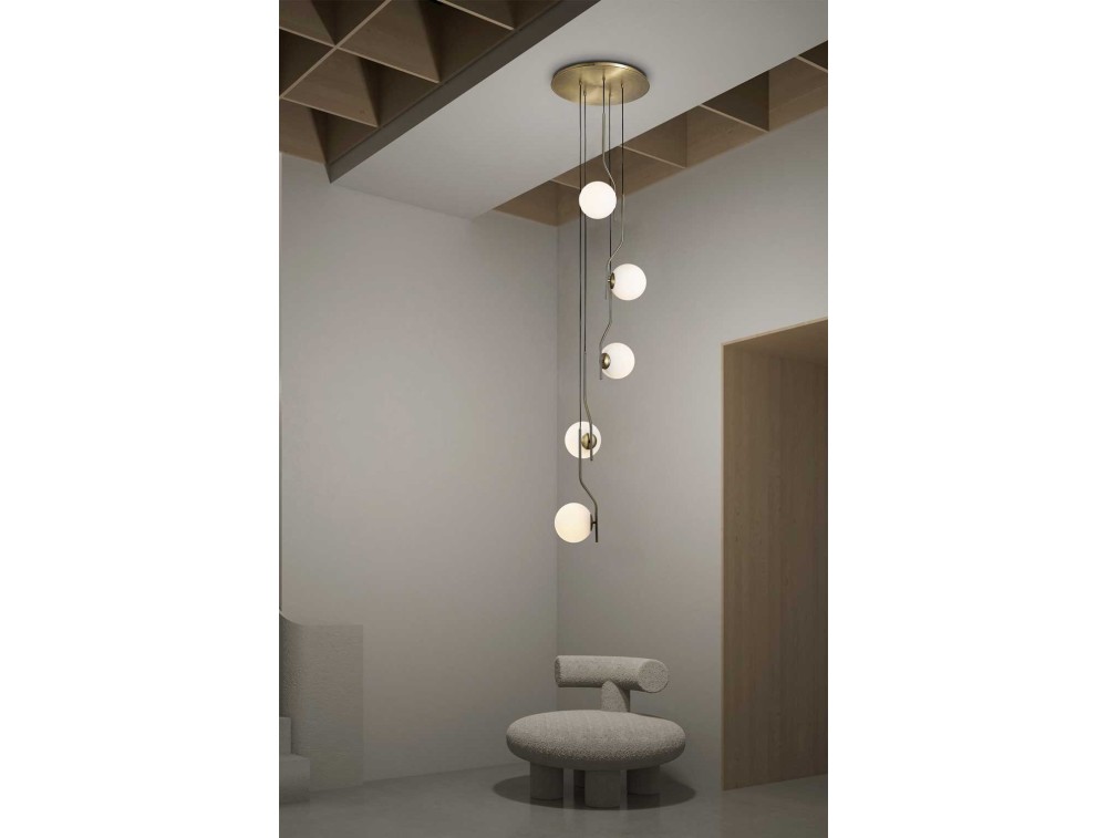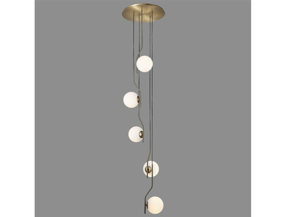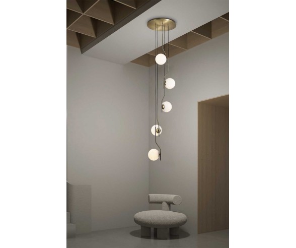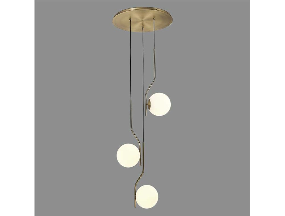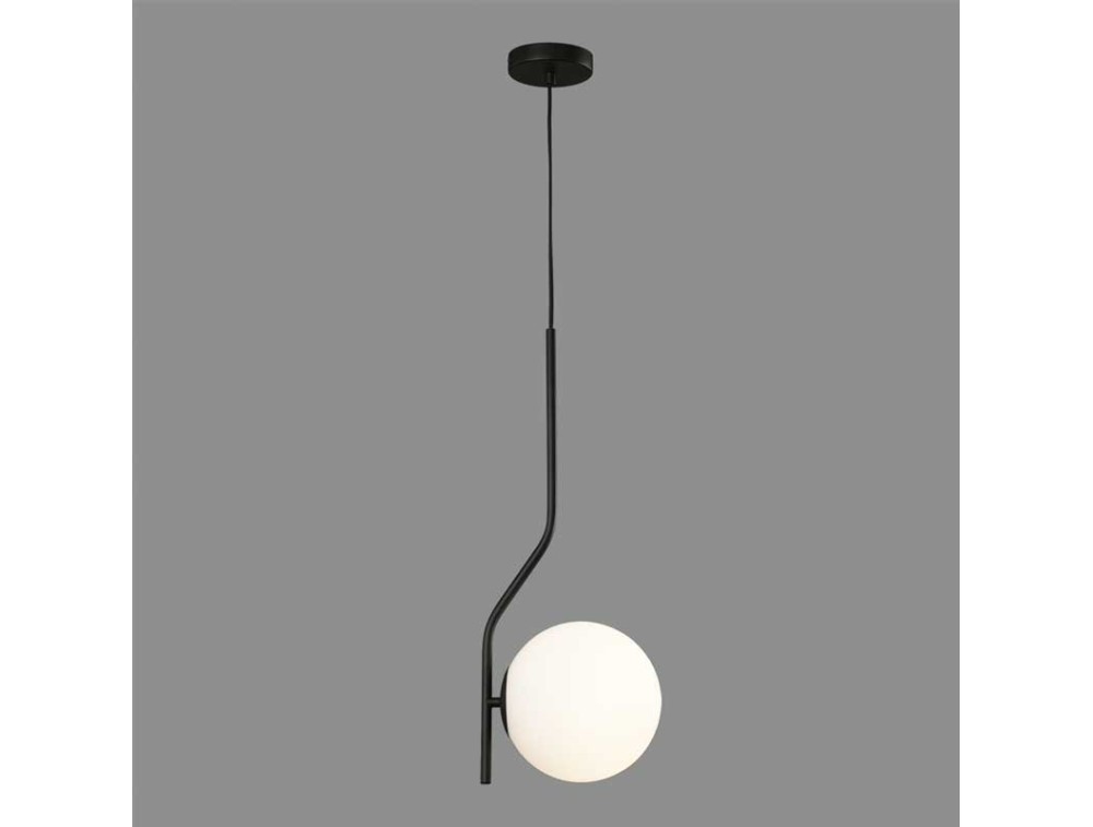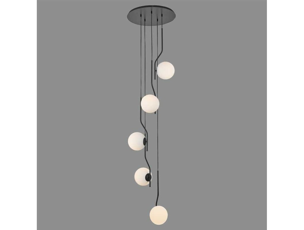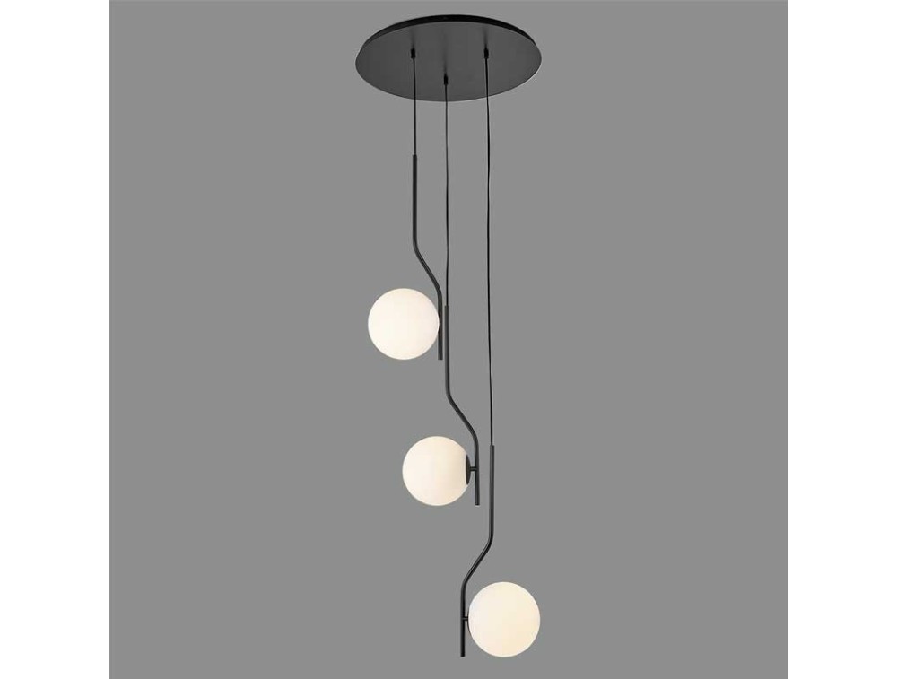 La lampada a sospensione MAUI del marchio ACB presenta una montatura in metallo di colore nero e diffusori sferici in vetro bianco opale.