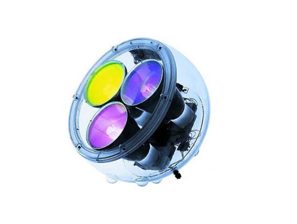 Piantana di design realizzata con struttura in metacrilato trasparente contenente i diffusori in policarbonato, lampada inclusa di telecomando. Sei piedini permettono di regolare il posizionamento con diverse inclinazioni. Tre proiettori con i filtri dicroici rosso, verde e blu consentono di ottenere infinite atmosfere di luce colorata regolabili attraverso un telecomando dal quale è possibile gestire 10 atmosfere standard, crearne e memorizzarne ulteriori 10 e agire sull’intensità luminosa. Un display nella lampada visualizza l’atmosfera selezionata.