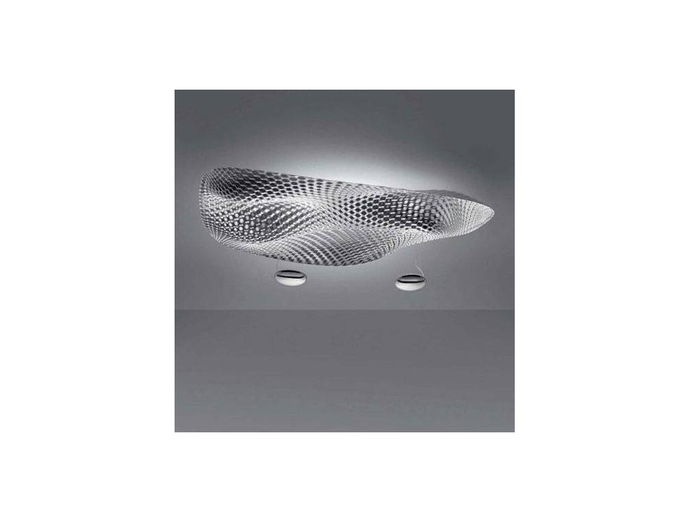 Plafoniera di design con corpo lampada-riflettore in materiale termoplastico e corpi illuminanti in alluminio pressofuso, diffusore superiore in metacrilato opalino. Riportando le parole del designer Ross Lovegrove: “Sono partito dall’idea di congelare un istante che sembra creato dall’aria che scorre su una lamina sottile, ottenendo un flusso e un ritmo molto naturali nel leggero rivestimento scultoreo. Il risultato finale è che l’apparecchio sembra sospeso contro la legge di gravità, su un cuscino d’aria… come il cosmo nelle forme e geometrie complesse che sembrano sfidare ogni spiegazione e creare un senso di infinito.”