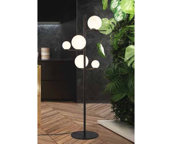 Gibas, lampada da terra in tubo di acciaio verniciato a polveri epossidiche in diverse finiture e da diffusori in vetro soffiato satinato bianco.