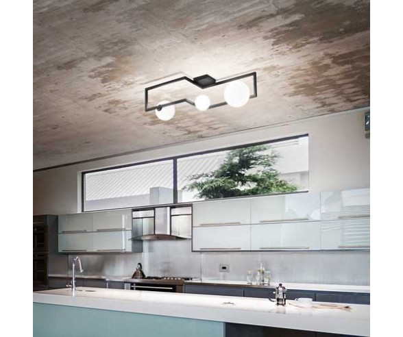 Plafoniera ad angolo, un capolavoro dal design minimalista e squadrato che si rivela un'opzione ideale per illuminare con stile ambienti residenziali, ristoranti e bar. La sua struttura angolare in metallo offre un tocco contemporaneo, mentre i diffusori in vetro bianco a forma sferica distribuiscono la luce in modo omogeneo a 360 gradi