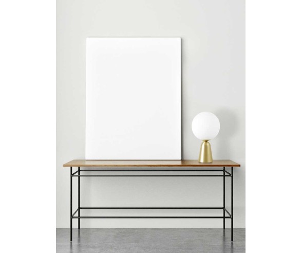 Si tratta di una lampada da tavolo, con un base in metallo di colore ottone dalla forma di cono rovesciato su cui troviamo il diffusore di forma sferica in vetro bianco opaco.