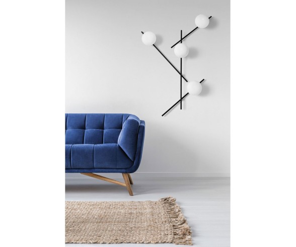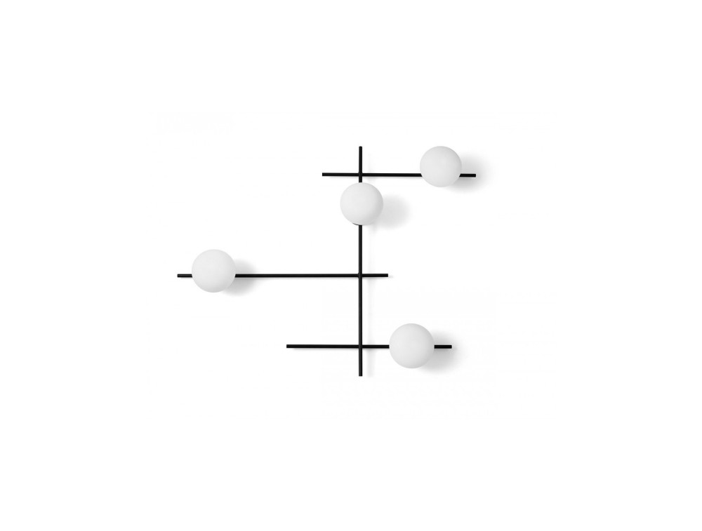Un'applique da parete personalizzabile, in quanto la struttura è composta da 4 bracci, di cui due, quelli secondari possono essere ruotati scegliendo fra 2 configurazioni. La struttura è in metallo verniciato di nero, mentre i diffusori sono di forma sferica interamente in vetro bianco latte. La forma a boccia dei 4 diffusori, dal diametro di 14 cm diffondono la luce in tutto l'ambiente circostante e sulla parete, disponibile anche nella variante con sfere trasparenti. Un'applique perfetta sia per illuminare ambienti residenziali ma anche commerciali, potrete creare atmosfere personalizzate attraverso l'abbinamento degli altri prodotti della stessa serie.