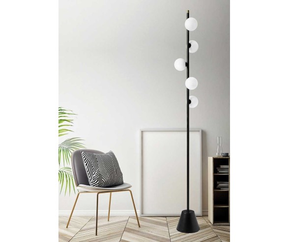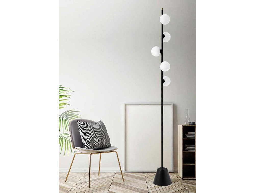 Il design di quasta piantana è caratterizzato da una montatura in metallo, a cui sono collegate 5 piccole sfere con diametro Ø10 cm, sfere interamente realizzate in vetro e rivolte verso lati diversi.