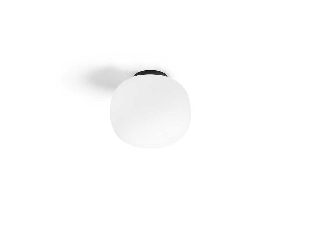 Moderna plafoniera dalle medie dimensioni con rosone in metallo nero e sfera schiacciata ai poli in vetro bianco latte.