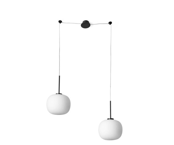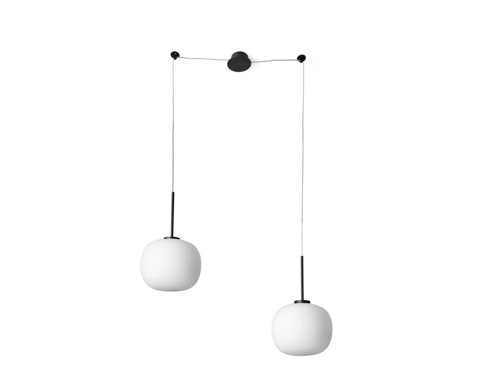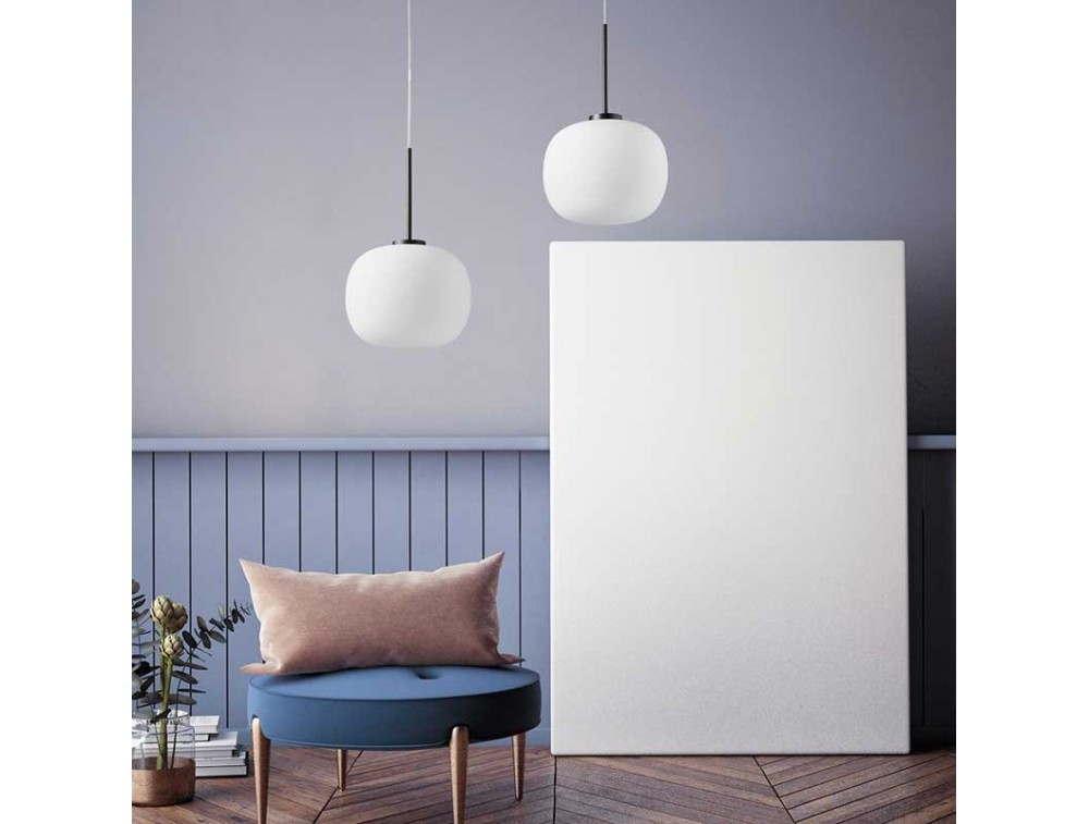 Lampada a sospensione composta da 1 luce o 2 luci in vetro soffiato Bianco Latte, montatura verniciata nera e cavo alimentazione trasparente. Kit a soffitto nero. Lampadina installabile E27 LED