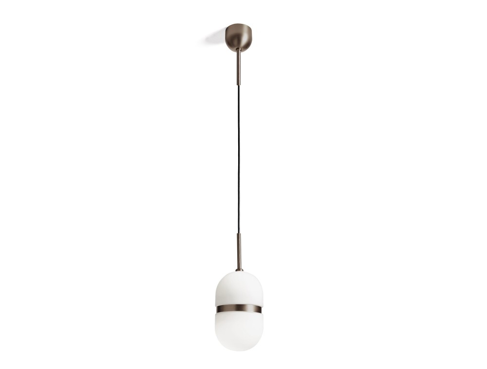 Con le sue forme geometriche, il pezzo centrale in vetro soffiato bianco latte, sospeso da un elegante supporto in bronzo. Un anello metallico bronzo abbraccia delicatamente il vetro