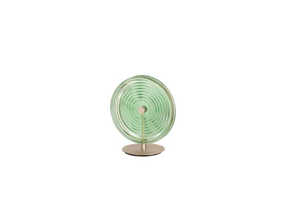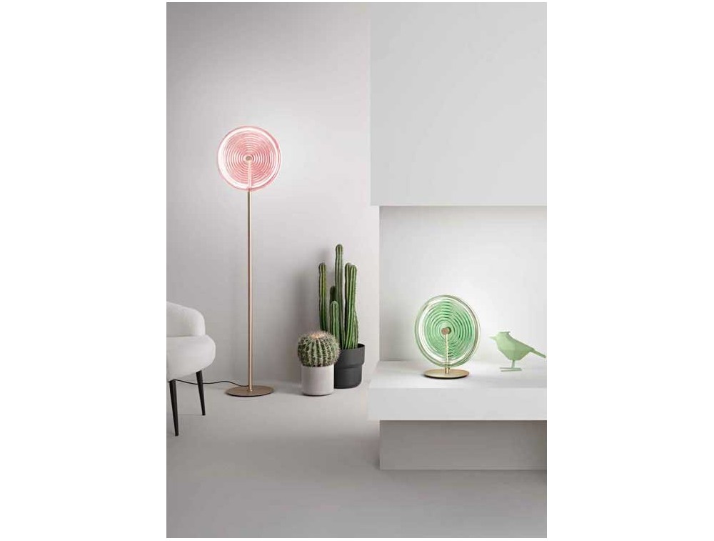 Collezione a LED in metallo verniciato e vetro decorato a righe concentriche. Montatura in metallo verniciato oro. Versatile per ogni tipo di ambiente, come sopra un comodino in camera da letto, o anche in soggiorno o in salotto.