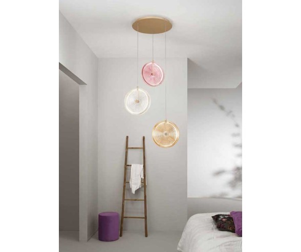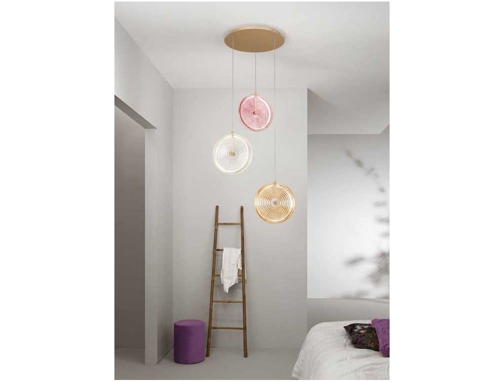 Lampada a sospensione di Design in vetro decorato a righe e struttura in metallo verniciato oro. Disponibile vetri in vari colori.