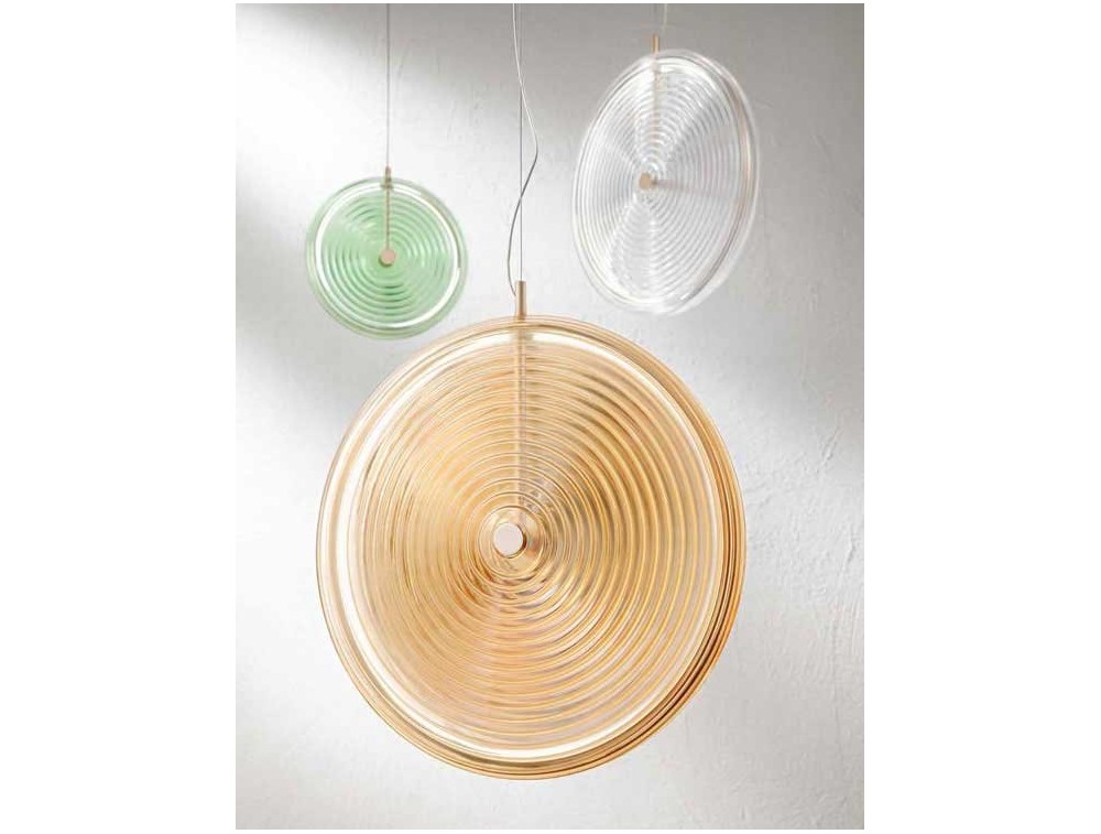 Presentata a EUROLUCE 2023 Jokey è una collezione a LED in metallo verniciato e vetro decorato a righe concentriche. Montatura in metallo verniciato oro. Disponibile nella versione singola o in multipli. Cavetti regolabili in lunghezza
