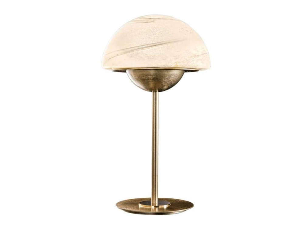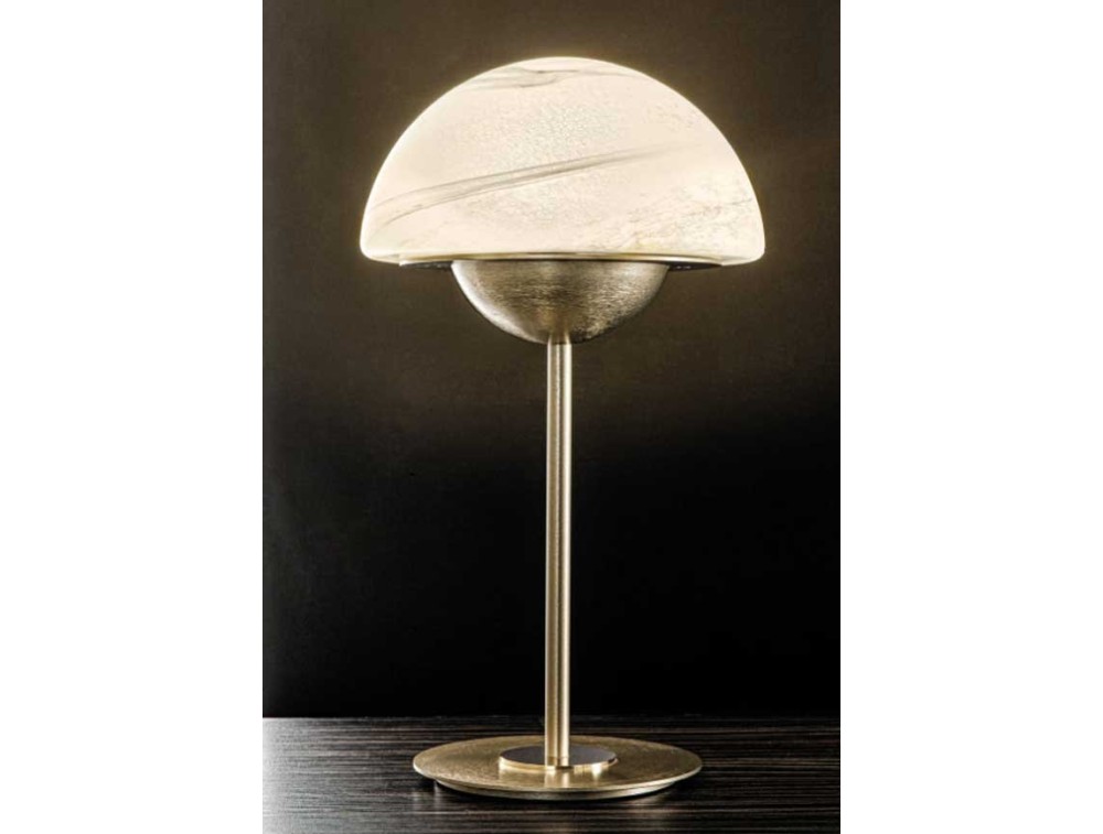 Lampada da tavolo Moon, del marchio italiano Sil Lux, con diffusore in vetro di Murano bianco alabastro e con una struttura in metallo con eleganti finiture oro spazzolato. Perfetta per cucina, salotto e camera da letto.