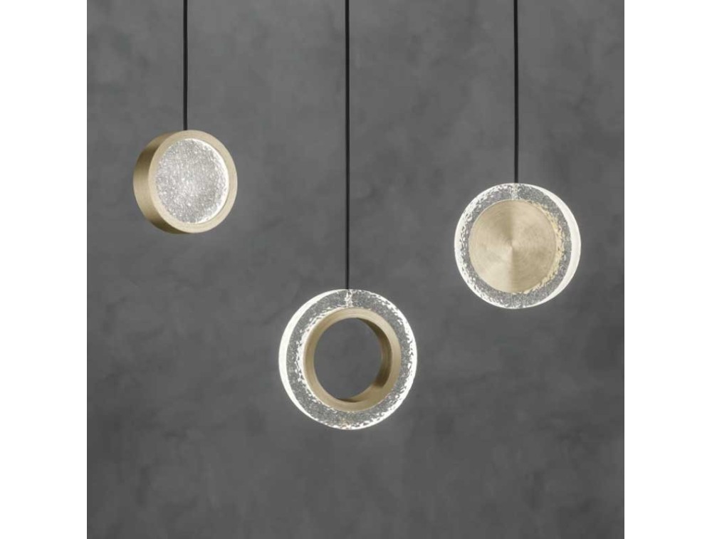 Sospensione led Yo-Yo firmata dal brand italiano Sil Lux, si presenta in 3 diversi modelli, strutturata in acrilico e metallo è perfetta per cucina, salotto e camera da letto. Il design artistico è l'elemento di spicco. Finitura in oro spazzolato.