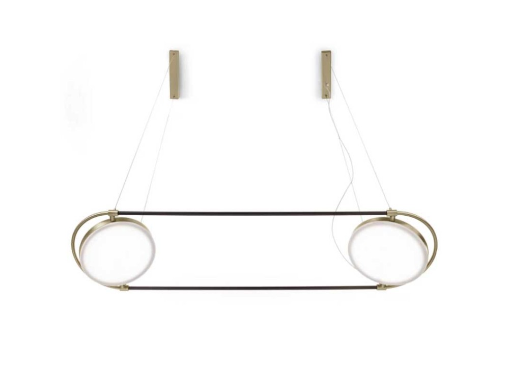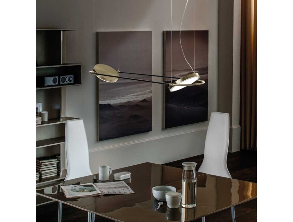 Sospensione led Giotto, del marchio italiano Sil Lux strutturata in metallo e acrilico, con i 2 paralumi inclinabili a piacere e uno splendido contrasto di colori e di forma, perfetta per cucina, salotto e camera da letto. Offre un'elegante combinazione tra nero e oro spazzolato.