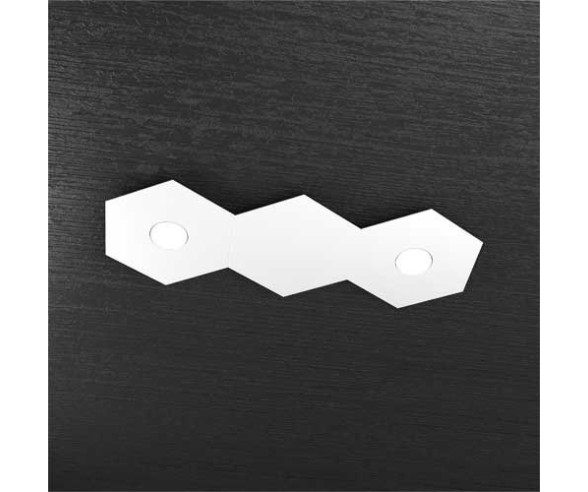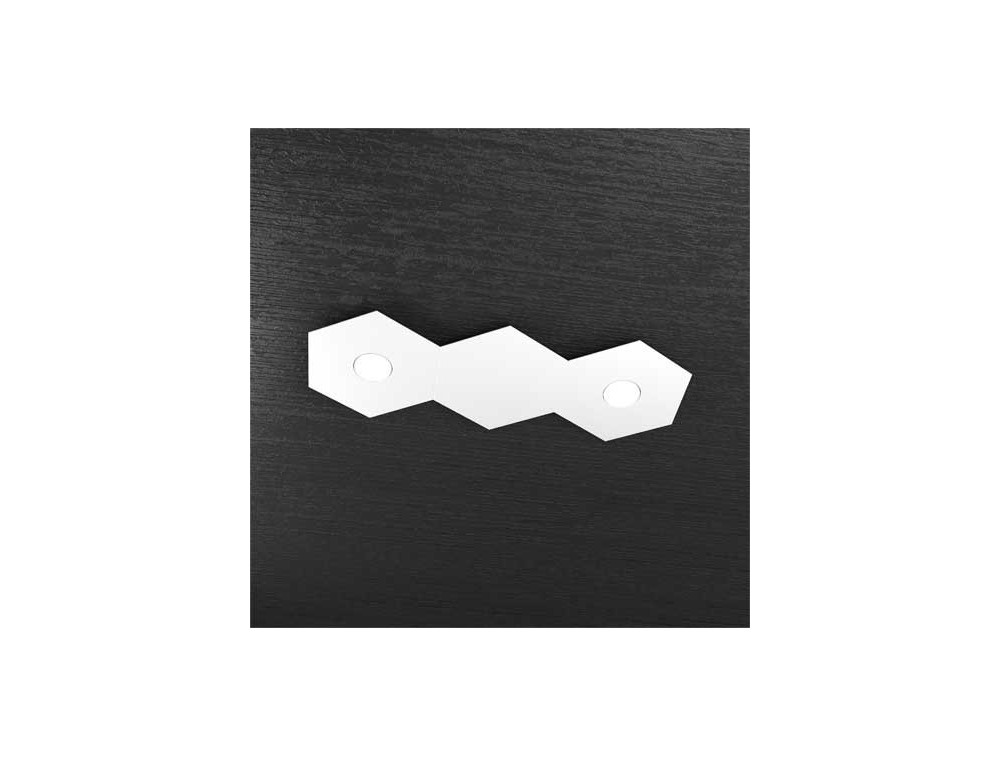 Plafoniera Hexagon da ingresso con n° 2 luci led e n°1 piastra a pannello decorativo tra le due luci che è possibile anche rimodulare in modo da cambiare forma. Dal design moderno, questa plafoniera è realizzata in metallo e ha una particolare forma esagonale, pensata da Top Light per la serie Hexagon.