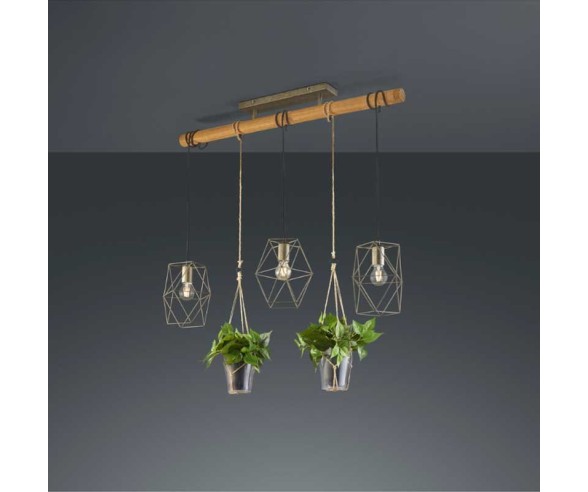 La lampada a sospensione PLANT di Trio Lighting è composta da piastra rettangolare in metallo nichel anticato, asta in legno con 3 cavi che sorreggono paralumi a gabbia in metallo e cavi in corda che sostengono delle piante decorative in vaso che fungono da elementi decorativi. Ogni cavo é regolabile in lunghezza singolarmente così da permettere di personalizzare l'altezza dei diffusori in base le proprie esigenze di illuminazione. È possibile installare 3 lampadine con attacco E27 da max 40 watt (acquistabili separatamente). Le lampadine Led garantiscono un'ottima resa luminosa e un basso consumo energetico. Una lampada a sospensione dal design moderno e ricercato, ideale per illuminare ed arredare con originalità la cucina o il soggiorno.
