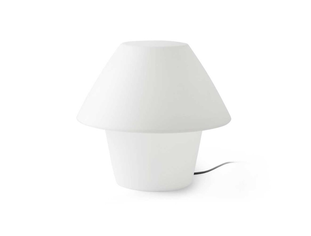 Lampada da tavolo o da terra realizzata con struttura bianca in polietilene opale. Protezione IP44