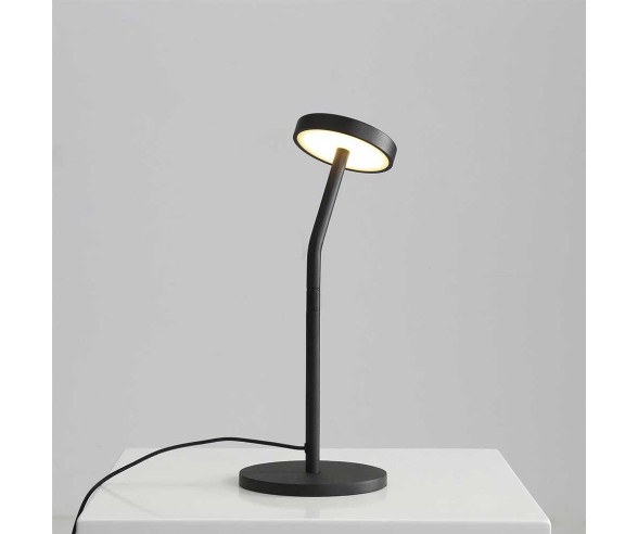 La lampade da tavolo CORVUS del marchio ACB presenta un fusto lineare in alluminio di colore nero testurizzato e diffusore composto da disco led. Il braccio flessibile consente di orientare la luce a piacimento. Interruttore ON/OFF su cavo.