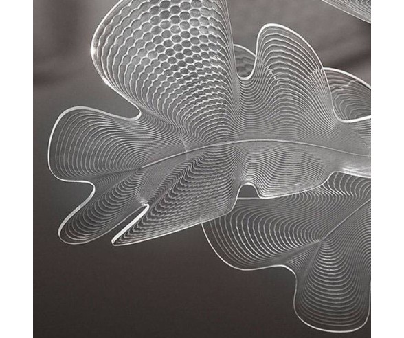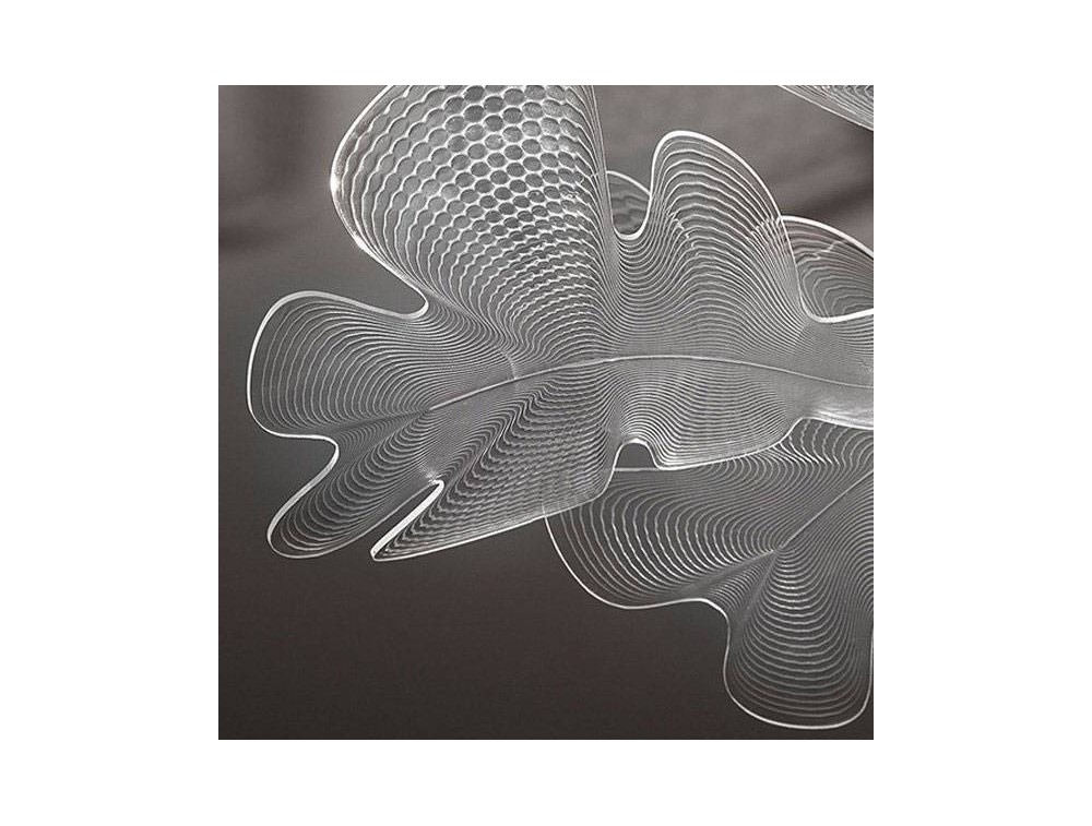 Chlorophila è una lampada elegante e molto decorativa. I suoi elementi diffusori, a forma di foglie sospese nell'aria, disposti a raggiera, si sovrappongono in parte per moltiplicare il gioco di ombre generando un effetto scenografico sul soffitto quando la lampada è accesa. Leggera ed eterea, questo nuovo progetto di Ross Lovegrove, si abbina facilmente ad ogni ambiente della casa.