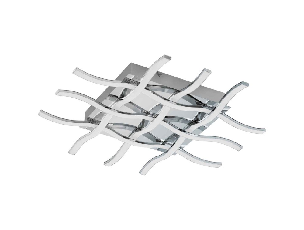 Applique o plafoniera led realizzati con struttura in acciaio cromo e diffusore in plastica bianca. Lampada composta da aste ondulate in acciaio collocate sulla base a soffitto o a parete di forma quadrata intersecate tra loro, grazie alla sottile sorgente led collocata in esse le aste riflettono il fascio di luce direttamente verso il basso ed indirettamente in tutto l'ambiente.