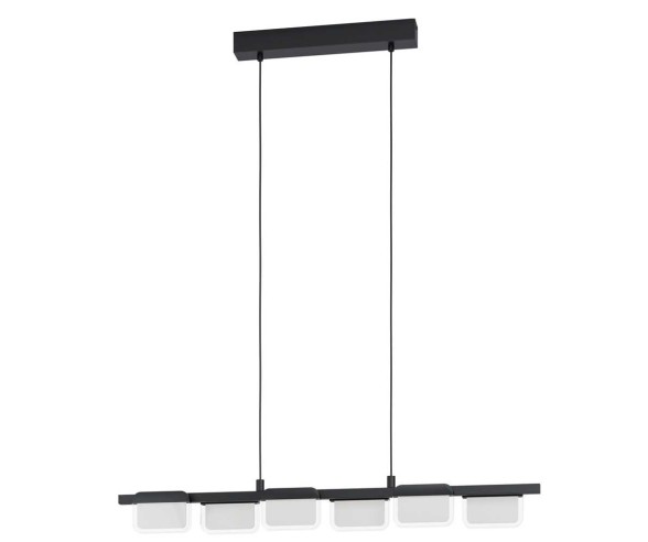 La lampada a sospensione a LED ERVIDEL è costituita da un baldacchino nero in metallo al quale è stato apportato un lungo supporto in metallo del medesimo colore, sul quale si trovano sei corpi luminosi in acrilico satinato disposti in modo alternato. I LED integrati emanano una luce bianca piacevolmente calda e sono dimmerabili alla parete tramite apposito dimmer girevole. Questa lampada a sospensione, in stile minimalista, si armonizza perfettamente con arredamenti dallo stile moderno e offre un’illuminazione particolare nel soggiorno o nella sala da pranzo, posizionata al di sopra del tavolo da pranzo.