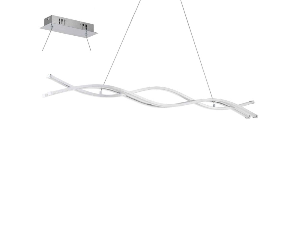 Sospensione led di design moderno realizzata con struttura in acciaio ed alluminio in finitura cromo e diffusore in plastica bianca. Lampada composta dal diffusore a due aste in acciaio collocate orizzontalmente ed intrecciate tra loro come a formare delle onde che contengono nella parte inferiore la sorgente led, sottile e funzionale questa sospensione è versatile e adatta in ambienti di design moderno di ogni dimensione.