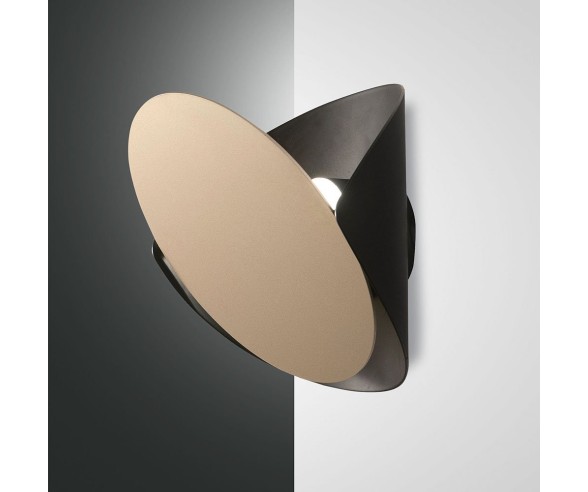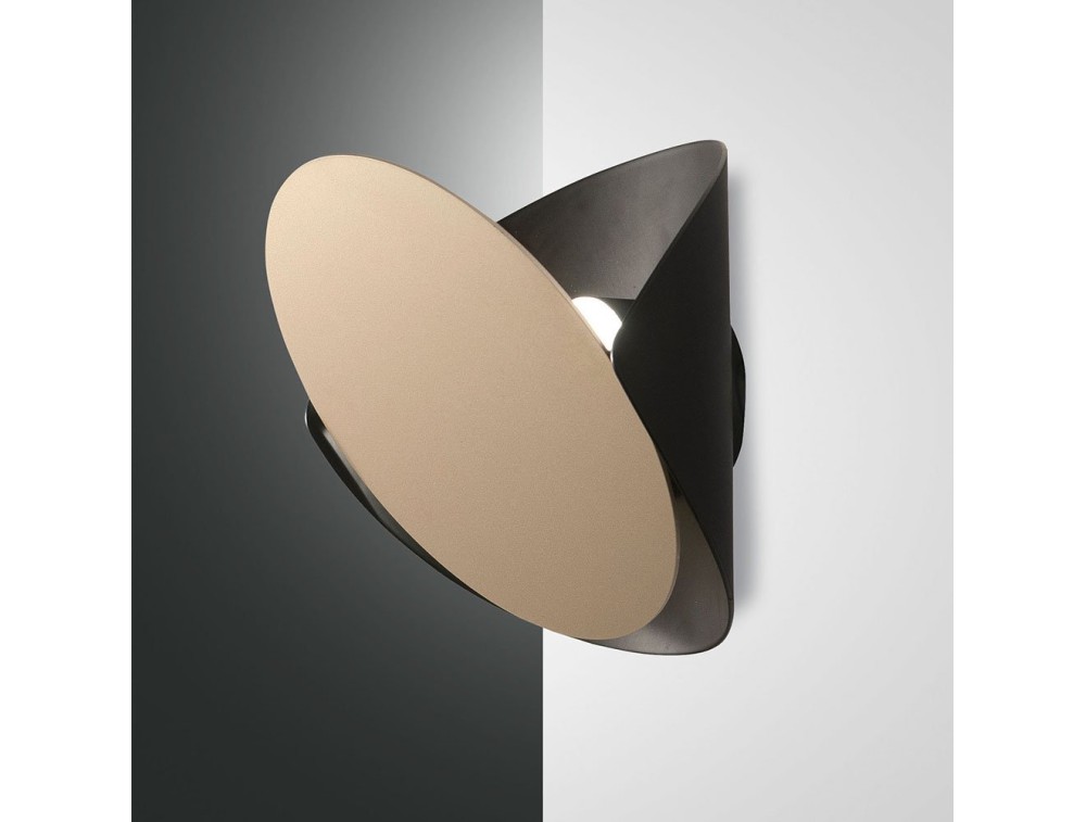 Shield è un applique dal design moderno in metallo composto da una struttura principale a forma di semicerchio nella quale viene inserita la sorgente luminosa. Alle due estremità di questo c'è agganciato un disco orientabile che permette di creare giochi di luce alla parete.