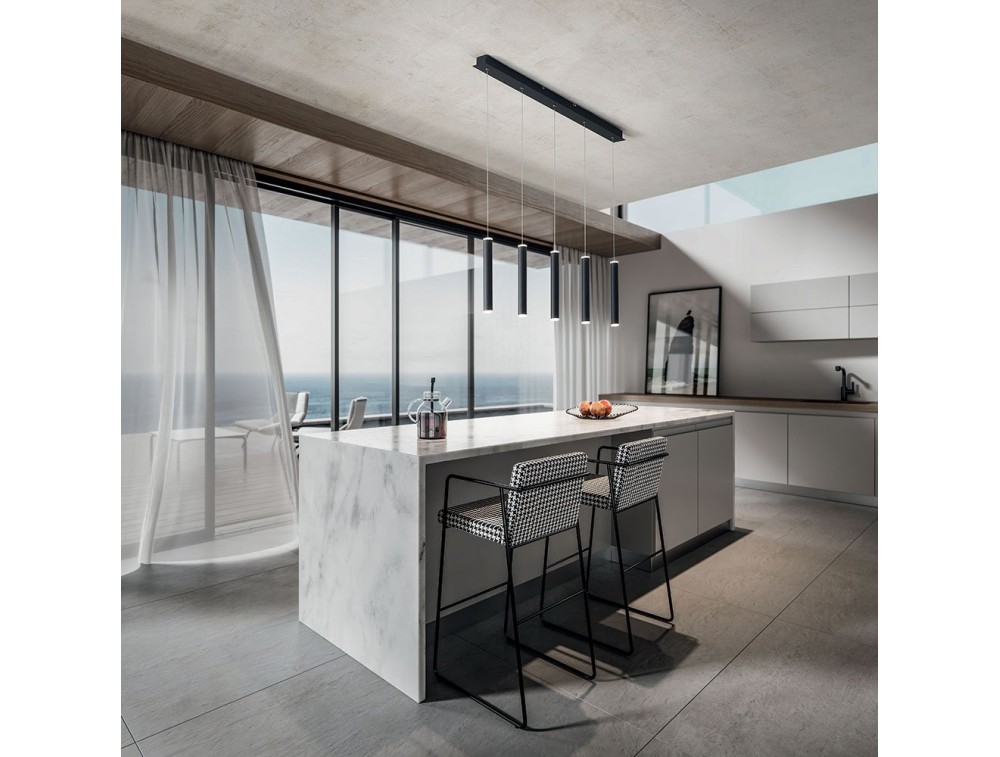 Prado è un lampadario moderno caratterizzato da un diffusore tubolare proposto in vari colori: nero, bianco e dorato.
